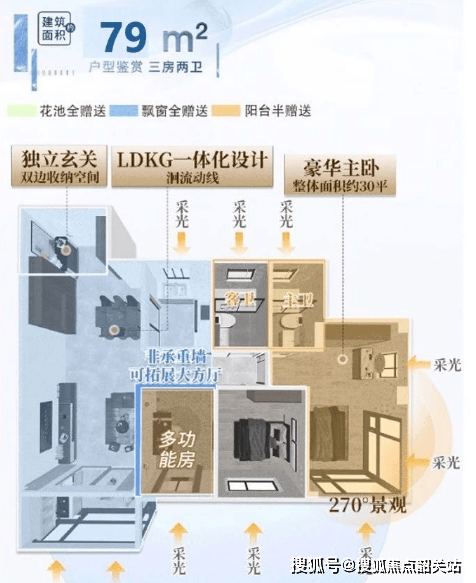 空间亮点:花池全赠送,飘窗全赠送,阳台半赠送,有效增加室内面积。