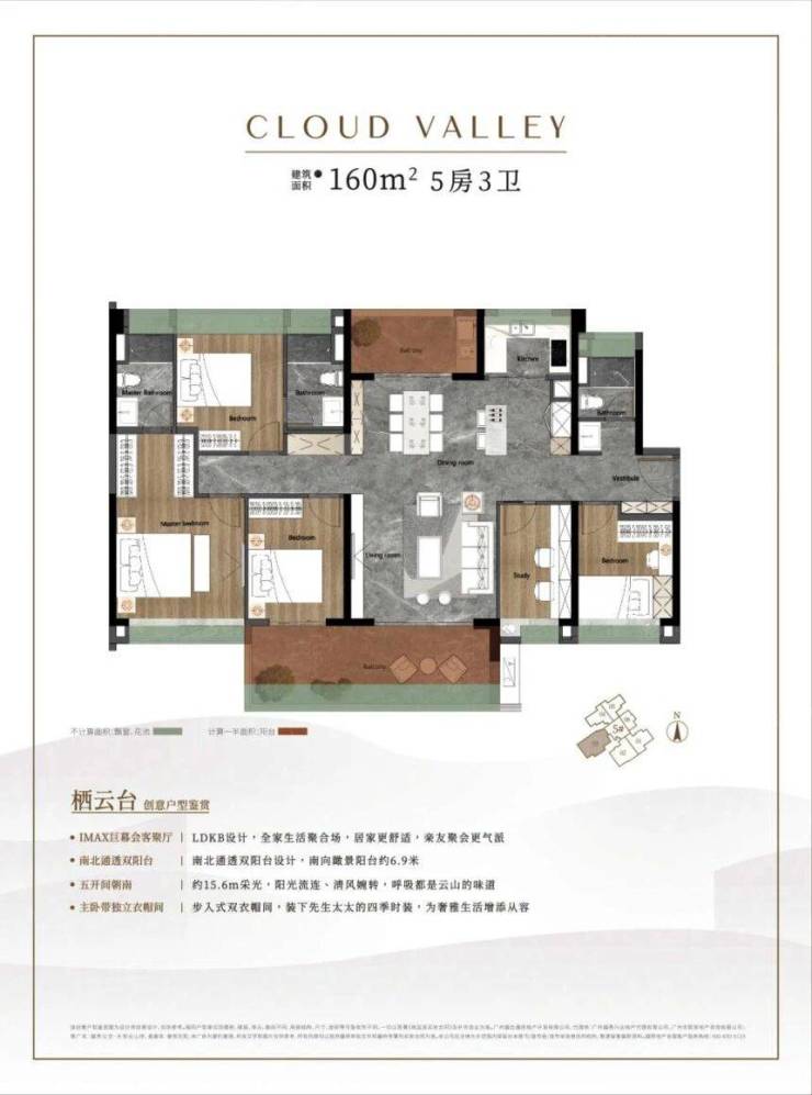 客厅挑高设计(部分户型),气势恢宏,彰显大宅风范。餐厅与客厅一体化设计,空间开阔,可容纳多人聚餐。厨房面积宽敞,操作台面长,储物柜多,满足大家庭的烹饪和储物需求。公共卫生间和工人房(如有)设计合理,功能完备。整体来看,一百六十平方米的五房户型,空间尺度阔绰,功能配置豪华,居住舒适度极高,是改善型家庭一步到位的理想居所。