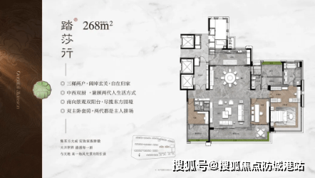 268㎡五房两厅三卫:总价约3,500万元起,3梯2户设计,双主套+保姆电梯,专梯专户私密尊贵,南向景观面超15米,直面5万㎡山顶公园与汇景高尔夫球场。