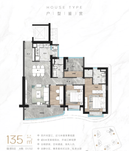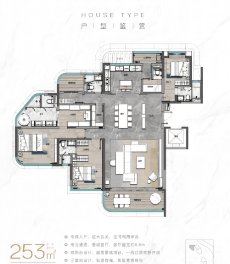 广州滨江上都在售户型面积从109平方米至253平方米不等,涵盖了三房至五房的大平层住宅。所有户型均采用高定智能化精装体系,配备绿色环保建筑材料、3M净水系统、新风系统等先进设施,旨在为居民创造一个健康舒适的居住环境。特别是临江大平层公馆,以距江不足100米的亲江距离和270°环幕全景落地窗设计,真正实现了将珠江之上的城市天际线收为私藏的美好愿景。