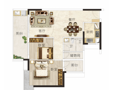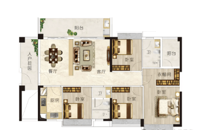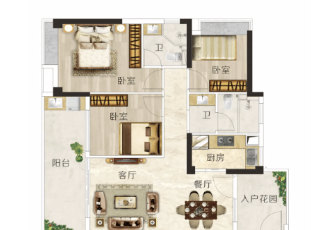 建面约106㎡三房:阔绰双厅设计,宴客会友从容大气;空中花园式阳台,成为全家人的休闲天地。