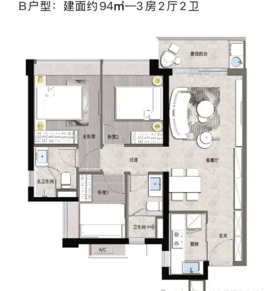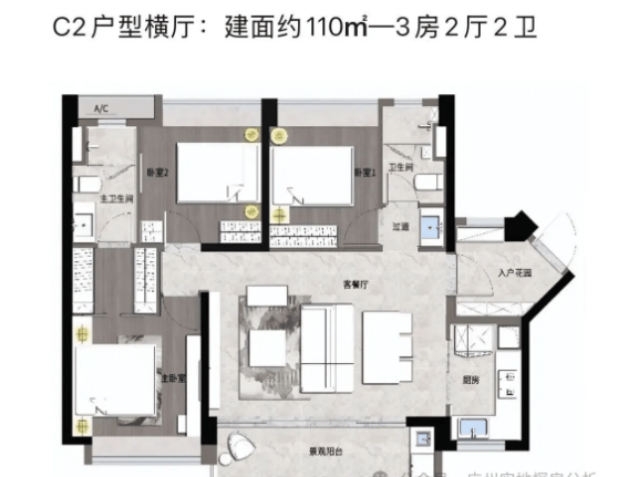 【C2户型】:南朝向,3室2厅2卫,建筑面积110㎡,分布于楼栋3号楼、1号楼。该户型在C1户型的基础上进一步优化空间布局,客厅空间更宽敞,阳台面积更大,视野更开阔。主卧空间升级,配备全景飘窗,增加空间通透性和实用性;次卧采光良好,适合作为儿童房或长辈房。