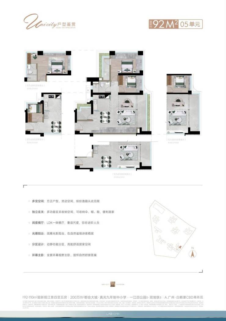 诚汇新都・力诚榕诚湾为啥能在白鹅潭商务区核心区脱颖而出呢?首先,它可是主城罕见大规模连片开发的城市更新项目一部分,总占地约 54 万㎡,涵盖 35 个地块,未来潜力无限。力诚榕诚湾自身占地约 5.2 万㎡ ,建面约 22.6 万㎡ ,容积率 3.5,绿地率约 47%,居住舒适度有保障。产品多样,从 92 - 110㎡超 130% 超新规江景四 / 五房,到 125 - 165㎡一线江景大四房都有。虽说目前周边配套有点欠缺,但小区配建商业,整个茶滘大城有超 60 万㎡商业,还有万豪酒店进驻。教育上配建学校,周边也有优质学校。交通虽地铁远,但楼下公交方便,还有远期地铁规划。这样的项目,无论是自住还是投资,都很有吸引力。