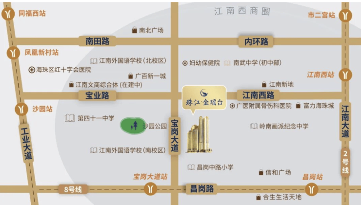 核心价值体现在“核心地段、交通便利、教育资源丰富、成熟商业配套”四大方面。项目距离地铁8号线宝岗大道站约500米,地铁2号线江南西站约800米,便捷抵达珠江新城及广州南站。周边省级名校环绕,包括汇源小学及江南外国语学校,满足家庭教育需求。商业配套完善,1公里范围内覆盖六大商业中心,生活便利度极高,为业主提供便利、高品质都市生活体验。