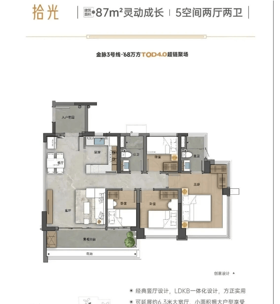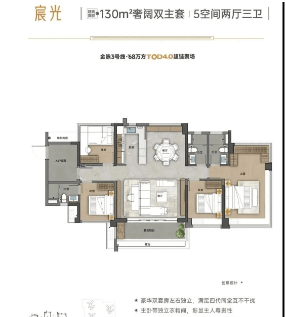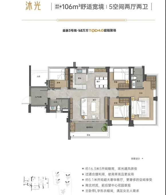 户型设计颠覆市场:项目提供了多种户型选择,从紧凑型的三房两卫到宽敞的五房,均具有极高的使用率。特别是部分户型赠送入户花园和270°环幕飘窗,为业主提供了更多的生活空间。