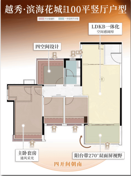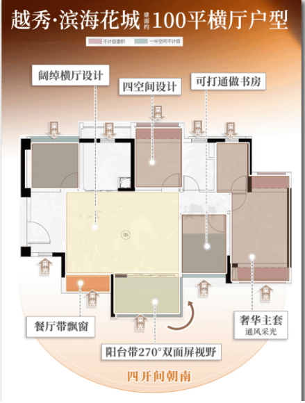 项目新推出的户型主要集中在约76-98㎡三至四房之间,其中部分户型拥有更开阔的南向采光面,加上全屋多飘窗设计,舒适度拉满。例如,约100㎡的户型有横厅和竖厅两种格局,通风和采光都接近板楼,非常适合家庭居住。
