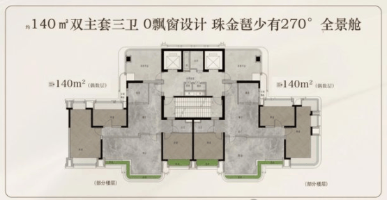 建面140㎡的四房两厅三卫户型,位于南地块的核心位置,赠送面积高达23.24㎡,使用率极高。该户型采用了南北对流的格局,客厅开间达到4.5米,宽敞明亮,视野开阔。双主套的设计,兼顾了私密性与实用性,主卧配备了步入式衣帽间与独立卫浴,让主人尊享奢华生活。次卧空间也十分充裕,足以满足老人或孩子的居住需求。阳台直面社区中央园林,高层房源更可远眺珠江江景,让居住者在繁华都市中也能享受到自然的宁静与美好。这种户型非常适合三代同堂的改善家庭,既能满足大家庭的居住需求,又能保证每个成员的独立空间。