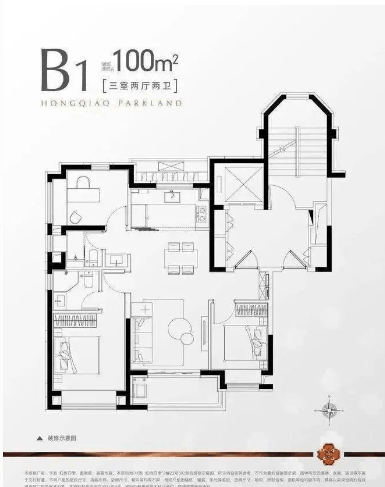 建面约100平方米的B1与B2户型,则是改善型家庭的明星产品。这两款户型同样采用了“飞机户型”布局,但空间尺度更为阔绰。三开间朝南,客餐厨LDK一体化设计,使得公共空间宽敞明亮,家人之间的互动更加频繁。三卧室分离,很好地保障了每位家庭成员的隐私。不同于市场上部分项目将北向房间定义为书房的尴尬做法,华发虹桥四季的每个房间格局方正,均为真正的三房设计,功能性与尺度感兼具。U型开敞厨房,预留冰箱尺寸,高厨房利用率;卫浴实现洗卫浴三分离,人性化设计满分;主卧套房配备大采光面飘窗,可打造办公、阅读、休憩等多种生活场景;边套北卧双面采光,使空间更加明亮通透。这两款户型是三口之家或三代同堂的幸福之选。