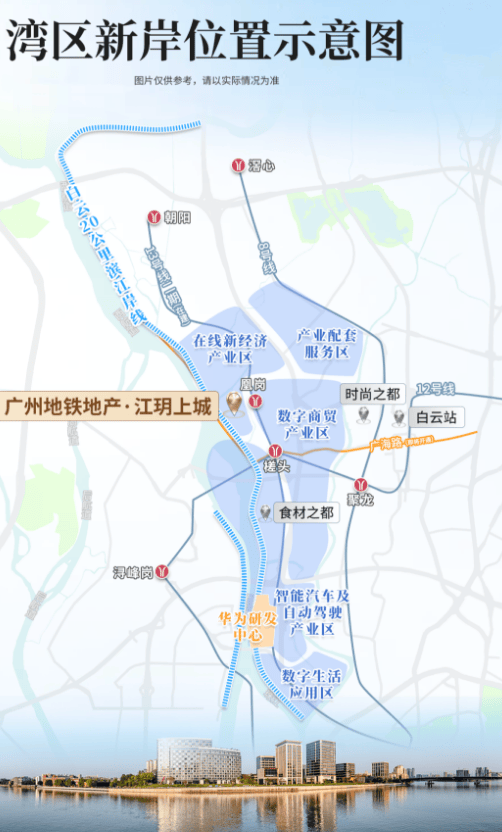 项目雄踞白云湾区新岸核心板块,定位珠江第四黄金十公里,是广州迈向世界级滨水区的战略新核。片区聚焦数字经济与科技创新,华为广州研发中心已正式启用,带动百度、安恒等大批科技企业入驻,形成千亿级产业集群,吸引大量高知高收人群,为区域价值与房产潜力提供坚实支撑。