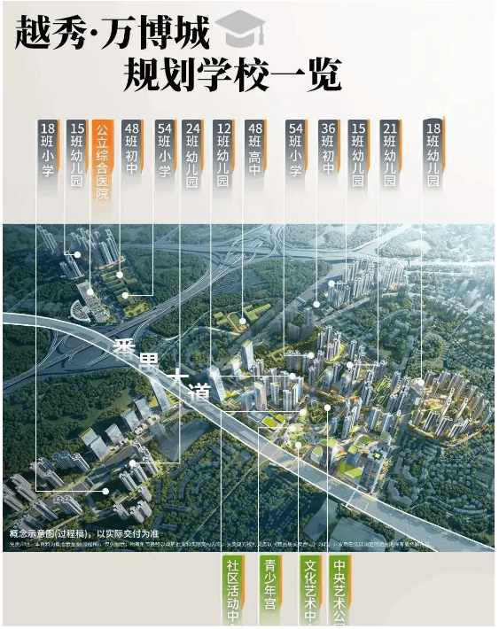 项目规划 12 所学校(6 所幼儿园 + 3 所小学 + 2 所初中 + 1 所高中),无需因升学换房,其中 CBD 组团内 54 班小学(里仁洞小学改扩建)与 36 班初中(新建)已官宣引入番广实验教育集团(广大附管理),与越秀大学城和樾府同属一脉。广大附教育集团综合实力稳居广州前四,2024 年高考清北录取 15 人,双一流录取率 60%,中考多校出 788 分状元;学校采用 “同教材、同教研、同考试” 模式,教育连贯性强,业主子女优先入读,解决改善家庭 “教育焦虑” 核心痛点。
