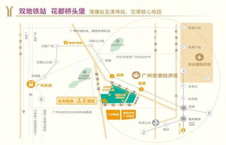 合和新城位于花都区迎宾大道3号,是进出花都的必经之路,并且位于花都空港经济的核心区域。项目紧邻广州地铁九号线清塘站和清㘵站,交通优势尽显。无论是通过轨道交通还是公交线路,都能方便快捷地到达目的地。