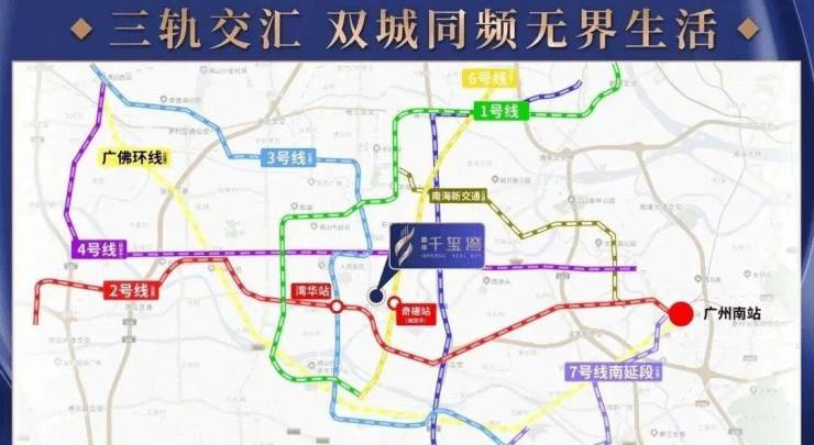 泰丰千玺湾拥有极其便捷的交通条件,项目毗邻佛山主干道,四横四纵路网贯穿禅城及佛山各区,快速连接南海、桂城及祖庙核心区域。交通优势不仅体现在地面道路上,项目周边还拥有完善的轨道交通网络,包括已通车的佛山地铁2号线及3号线湾华站,同时规划中的佛山地铁6号线奇槎站距离项目约500米,未来广佛通勤将更加顺畅。项目至广州南站仅约15分钟车程,轻松实现广佛同步生活。三双地铁交汇,地铁换乘便利,使项目出行时间大幅缩短,为业主提供日常通勤、商业出行和休闲出行的多重便利,极大增强项目置业价值和升值潜力。