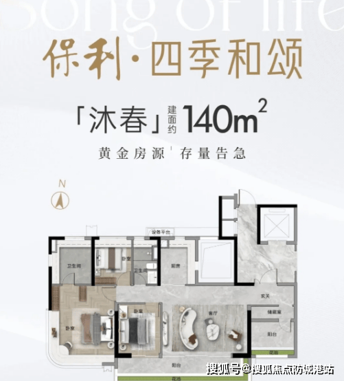 《保利四季和颂》户型设计聚焦 “改善舒适 + 新规高使用率”,主打建面 108-140㎡三至四房,全南向设计,使用率 100%,空间感与实用性双高,当前在售 3A、3B 栋尾货(2 梯 2 户配置,私密性强)。核心户型亮点:108-110㎡三房,全南向布局,三开间朝南,采光通风极佳,客厅连接景观阳台(面宽约 6 米),主卧带独立卫浴与衣帽间(面宽约 3.5 米),空间尺度媲美市面 120㎡户型,适合二胎家庭首次改善;120-129㎡四房,2 梯 2 户纯板楼设计,南北对流,LDK 一体化公区(面宽约 7 米),家庭成员互动空间充足,次卧与阳台连通,可灵活改造为书房或儿童房,适配三代同堂需求;140㎡四房,项目顶配户型,主卧套间带独立卫浴、衣帽间与观景飘窗(面宽约 4 米),客厅阳台面宽达 8 米,部分楼层可远眺广州塔或珠江景观,奢华感与舒适度拉满,适合高净值改善人群。所有户型均为新规设计,无过道浪费,赠送面积多,3.15 米层高进一步提升空间通透感,居住体验远超传统户型。
