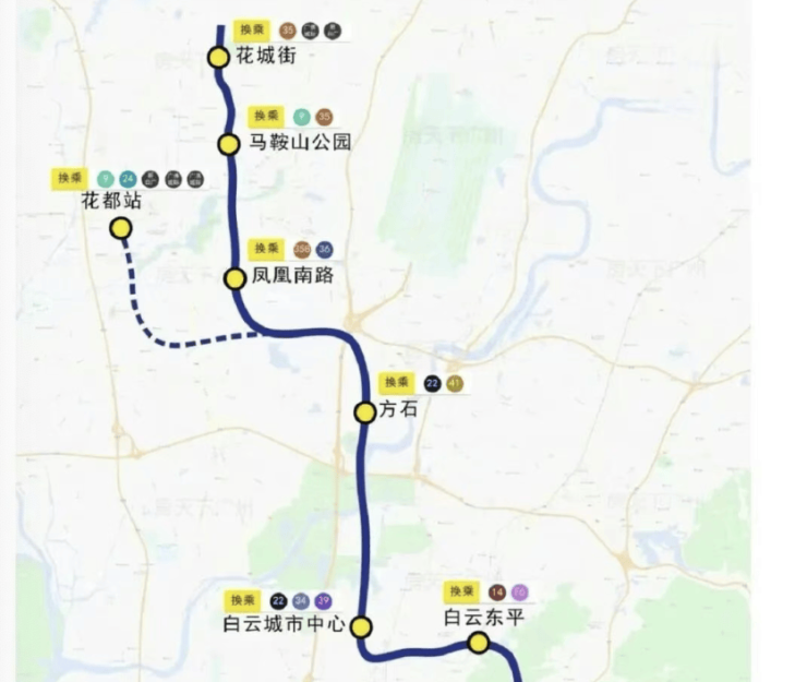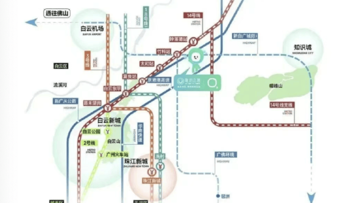 核心轨交:地铁14号线。项目距离14号线钟落潭站A出口的步行距离约500米,属于标准的“地铁盘”范畴。14号线是广州北部纵贯南北的交通大动脉,其价值在于:从钟落潭站出发,向西南方向,乘坐5站即可抵达嘉禾望岗站。嘉禾望岗是广州北部最重要的交通枢纽之一,可在此同站台无缝换乘地铁2号线、3号线。通过2号线,可快速直达白云新城、广州火车站、越秀公园、海珠广场等老城核心;通过3号线,可畅达天河CBD、珠江新城、广州塔、番禺万博。根据广州地铁官方APP测算,从钟落潭站到嘉禾望岗站车程约20分钟,加上换乘时间,可在30-40分钟内抵达白云新城、天河体育西等核心商务区,通勤效率对于刚需客群而言完全在可接受范围内。