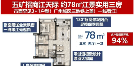 五矿招商江天际现楼在售,提供多种优质户型选择,面积涵盖 78 - 110㎡以及 118 - 140㎡。各户型均展现出超高的实用率,如 78㎡三室两厅一卫户型,赠送入户花园,实用率超 94%,卧室全明飘窗,U 型厨房设计实用,主卫干湿分离,还能实现最高三卧瞰江,市面罕见。88㎡三室两厅两卫户型,实用率超 92%,赠送入户花园,主卫干湿分离,宽尺主套预留衣帽间空间,南向望江可享 270° 瞰江视野。110㎡四室两厅两卫户型,实用率近 99%,南北双阳台对流,四开间朝南,三卧室南向瞰江,尽享江景。140㎡四室两厅三卫户型,方正宽奢布局,巨幕观景阳台,双套间大面宽,拉阔生活尺度。