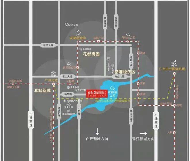 项目处于花都湖板块核心位置,地理优势突出。临近白云机场和广州北站两大国际枢纽,未来将进一步强化空港经济及商务区发展。社区距离地铁9号线花城路站和花果山公园站仅约8分钟车程,便捷接驳广州北站及市区主要节点。