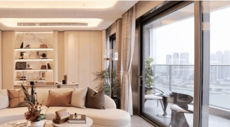 答:项目层高约3.4-3.6米,搭配LDKG一体化设计与全景玻璃,空间开阔通透、采光充足,具备极强的尺度感与舒适度。