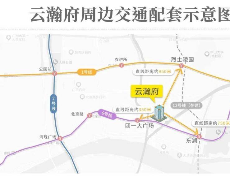 云瀚府地处城市中轴,此优越的地理位置,将城市占位的稀缺与尊贵展现得淋漓尽致。项目周边城市资源丰富,以云瀚府为中心,1公里步行范围内,越秀顶配城市资源星罗棋布。约350米处便是地铁6号线团一大广场站,便捷的轨道交通,使您1站可达北京路、6站直达珠江新城,生活半径得以延伸至全城,轻松畅享城市繁华。