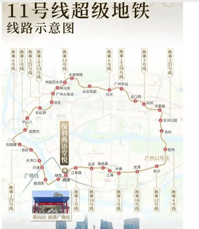 交通网络: ▸ 地铁:广佛线燕岗站(已开通)+11号线燕岗站(2026年底通车)双轨交汇 ▸ 公交:546路/583路等8条线路直达琶洲、越秀 ▸ 自驾:工业大道-内环路20分钟直达珠江新城