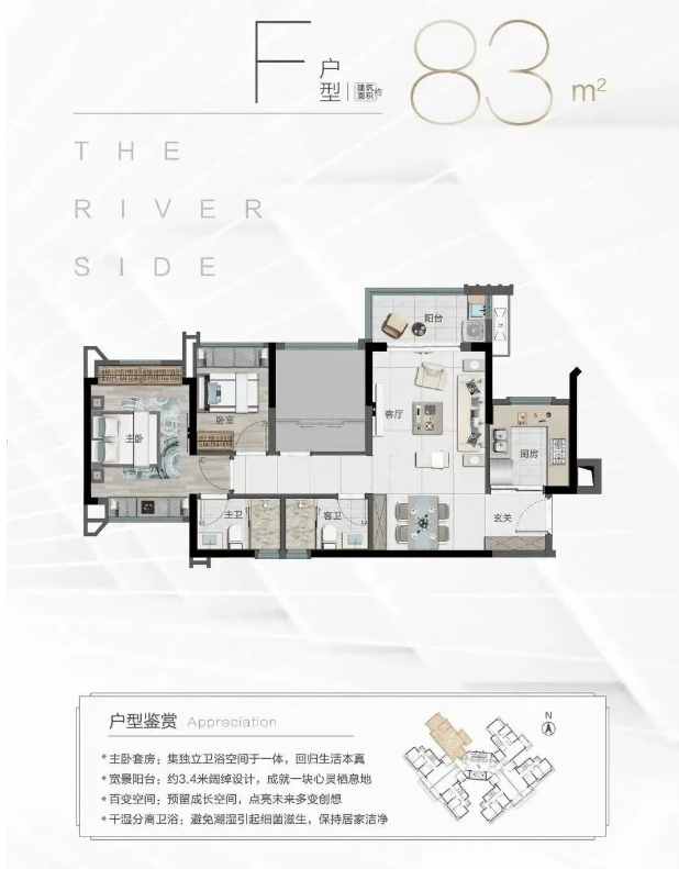 建面约83平/84平:两居室设计,布局合理,空间利用率高。