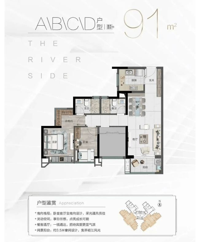 建面约91平:三居室设计,适合小家庭居住,功能分区明确,舒适度极高。