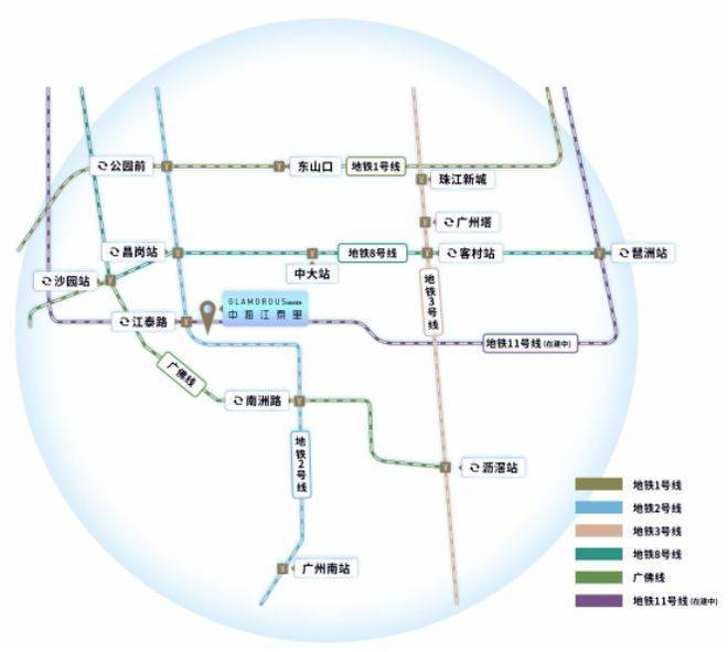 交通便利性是中海江泰里的一大亮点。项目坐落于海珠区江泰路 50 号,与地铁 2 号线江泰路站 A 口距离仅 150 米,步行 3 分钟便可轻松抵达。作为双地铁交汇枢纽,搭乘 2 号线 7 站可达珠江新城,而未来 11 号线开通后,将快速串联琶洲、广州南站等城市核心区域,极大提升通勤效率。地面交通同样发达,小区门口 190 米处即为江泰路地铁口总站,244 路、192 路等 10 余条公交线路覆盖海珠、越秀、天河等区域。自驾出行也极为灵活,经江南大道、东晓南路可接驳内环,实现广佛同城便捷出行。