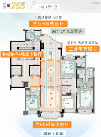 265㎡五房三厅五卫:奢阔层高,动静分区合理,满足高端家庭对空间舒适度的需求。