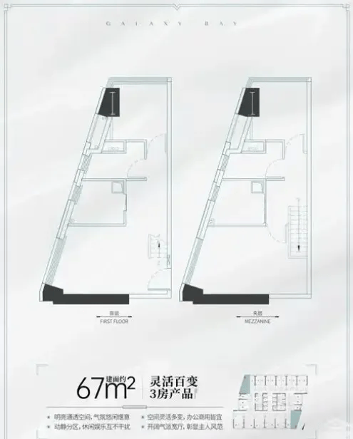 建面约 36-74㎡临江 LOFT 产品,4.5 米层高可做分层设计,是个性置业者的优质选择。4.5 米的挑高,让空间有更多的设计可能,可做上下两层,一层作为客厅、厨房、卫生间,二层作为卧室、书房,实现动静分离。部分户型为双钥匙格局,可分为两个独立的居住空间,一套房子能租出两份租金,投资回报率更高。LOFT 产品空间利用率更高,适配多种居住或使用场景,不管是自住还是投资,都十分合适。