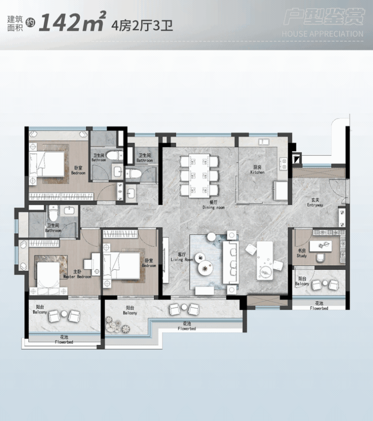 125㎡四房:南北通透,主卧套房设计,二胎家庭首选;