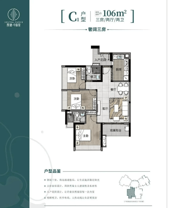居住场景:适合三口之家、三代同堂,夫妻住主卧,老人住南向次卧,孩子住次卧,客厅宽敞,家庭聚会、孩子玩耍都合适;双卫生间设计,早上不用抢厕所,南北通透,通风极佳,夏天凉爽。