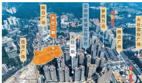 整个大壮名城项目体量达 400 万方,其中商业配套占 200 万方。周边已有萝岗万达广场、科学城商业广场、至泰广场等成熟商业体。大壮映日广场已封顶并进行布局微调,大壮国际广场 A/B 地块规划为广州第二家超五星级购物中心,未来将成为黄埔商业新地标。项目二期旁边的揽月广场进一步丰富了商业业态,为居民提供了多元化的消费、娱乐选择,将不确定性降到最低,真正实现所见即所得的便捷生活。