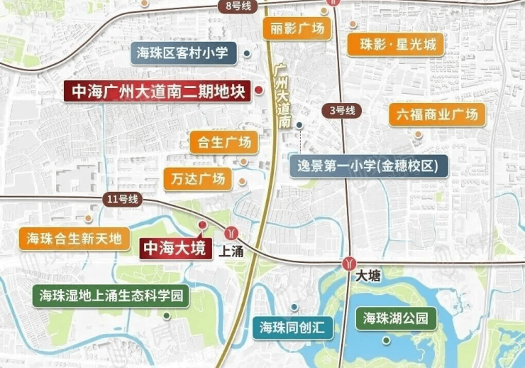旁边现有华海九年一贯制学校,即华附海珠国际双语学校,项目西北面直线2公里就是中山大学。