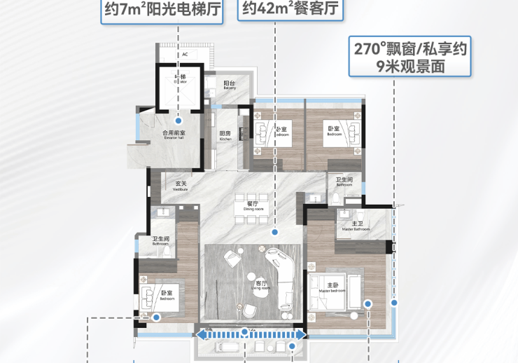 3、窗地比高达38%,主卧设置270°大飘窗。