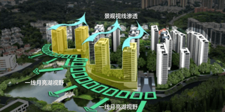 4,景观不错,45-52米的低密度小高层,按照“前低后高”的建筑高度控制,形成朝向湖区梯级跌落的设计,大地块西北向望湖景,小地块西向往湖景。