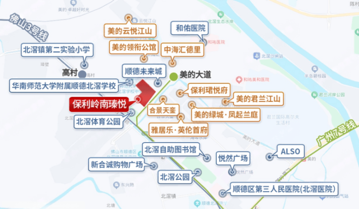 项目的地段位置是它的主要优势之一。根据资料显示,它距离广州地铁7号线美的大道站大约300米,一路之隔是北滘体育儿童公园和华南师范大学附属北滘学校。北侧不远处有中海汇德里公园街区,盒马超市预计这个月底开业,未来业主下楼就能逛。