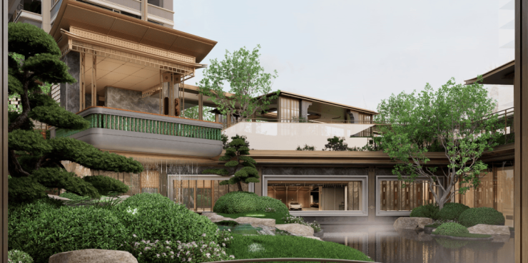 项目的设计风格走的是新中式路线,融合了岭南建筑元素。入口设计采用了约120米宽的尺度,运用了丝珐琅、大漆等传统工艺。园林规划则强调三进式岭南园林概念,融入了九种非物质文化遗产元素。