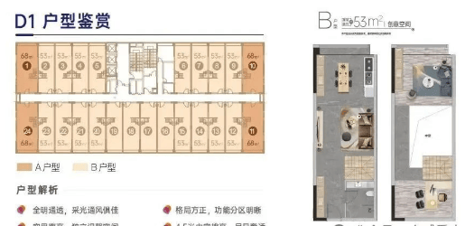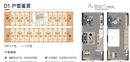 D-2公寓:从36-68㎡不等的多种户型选择,满足不同住户的需求。
