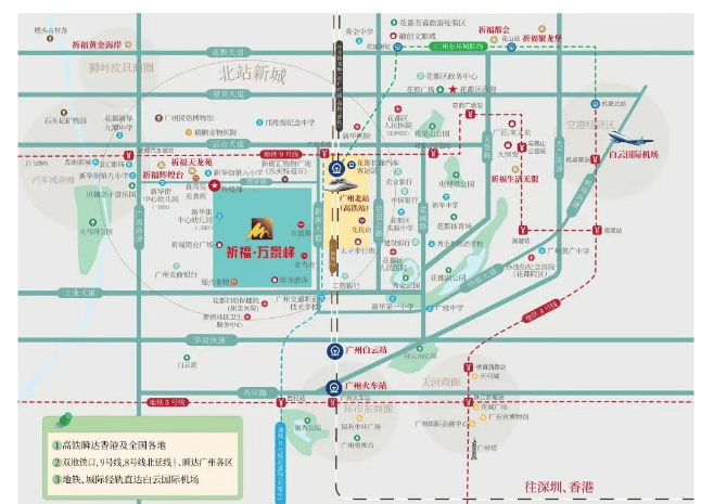 地铁:紧邻广州北站地铁口,双地铁交汇,9号线已开通,一次换乘直达珠江新城。8号线北延段建设中,建成后将贯穿白云、越秀、荔湾、海珠等广州各区。