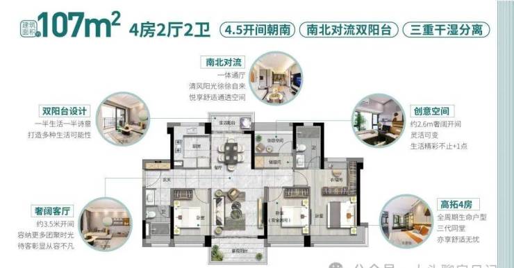 107㎡四房:新塘唯一107㎡南北对流双阳台四房,独门独户设计,私享独立过道,前后无遮挡,可同时揽小区园林与四望岗公园景观。