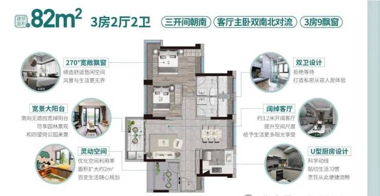 82㎡三房:实现客厅+主卧双南北对流,四开间朝南,赠送约13㎡,空间感远超同面积段产品;