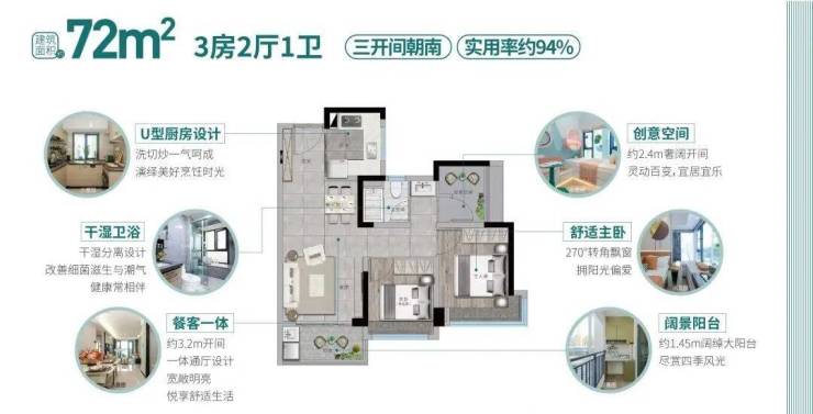 72㎡起高赠送三房,94%实用率刷新刚需标准