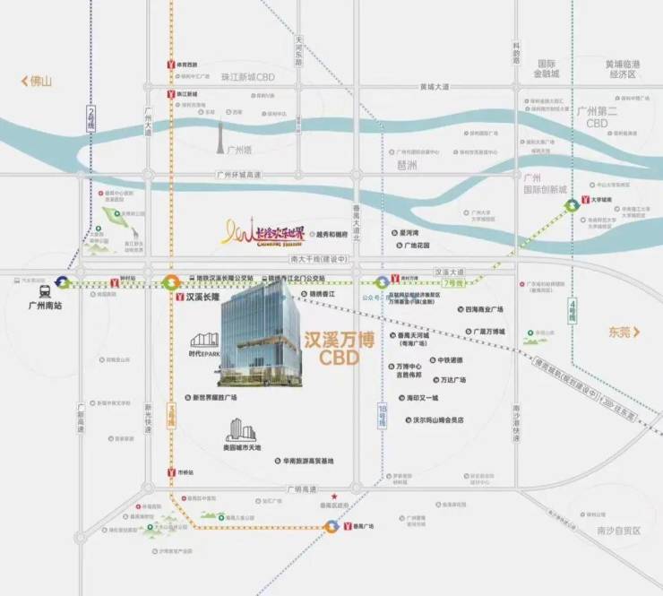 汉溪·万博商务区作为番禺的重点发展区域,汇聚了大量的高端商业、商务、文化等资源,是广州新兴的商务中心之一。项目周边交通便利,地铁3/7号线交汇,与城市各区域紧密相连。同时,毗邻长隆旅游度假区、广州南站等重要交通枢纽与旅游景点,人流量巨大,商业氛围浓厚,区域发展潜力巨大,为企业提供了广阔的发展空间。
