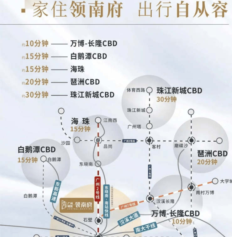 自驾:经汉溪大道、南大干线,20分钟畅达万博CBD,30分钟直达珠江新城。