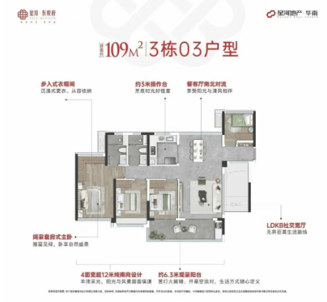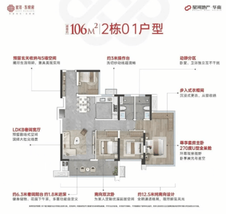 约106㎡:四开间南向四房,带有6.3米大阳台。