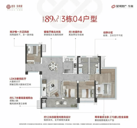 约89㎡:四房两厅两卫,南北对流设计,全赠送飘窗。