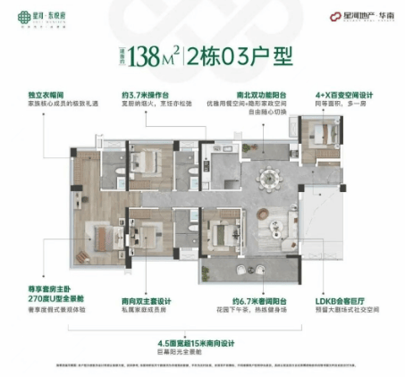 约138㎡:双主套4+1房,南北对流设计,适合大家庭居住。