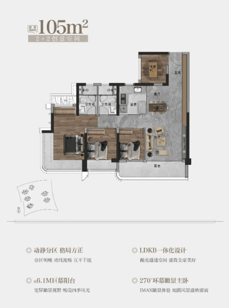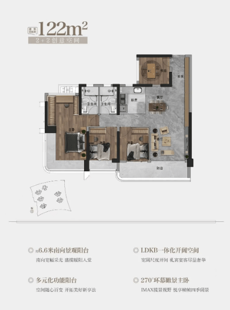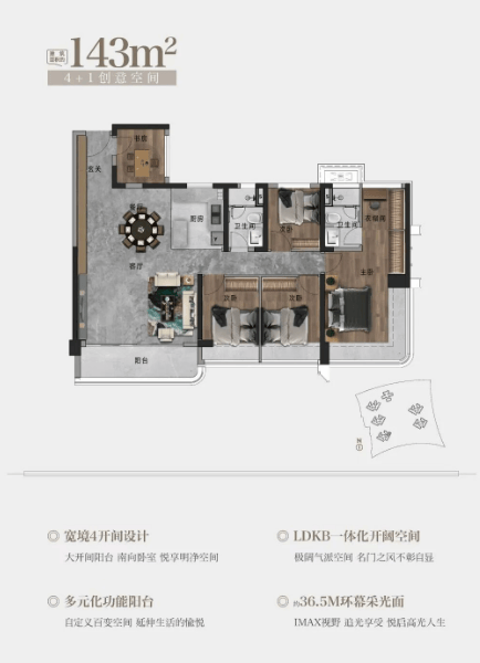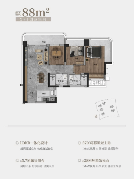 大壮名城·名门二期共规划了6栋楼,41-47层高,采用蝶形楼+围合式布局的设计,使得楼间距更加开阔,采光通风效果更佳。所有户型均设计了宽约1.5米、长约5.5米至6.4米不等的长阳台,以及L形270°视角大飘窗,保证了户户视野无遮挡。例如,88平方米户型拥有约5.7米巨幕阳台,而143平方米户型更是达到了约36.5米环幕采光面,极大地提升了居住舒适度。