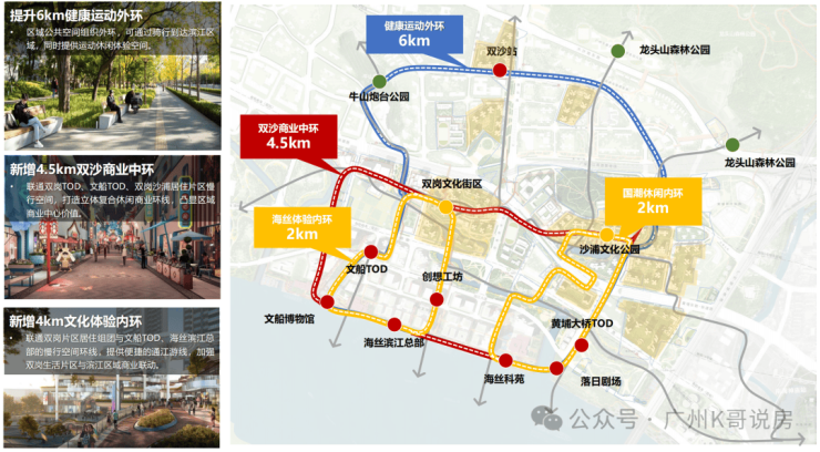 构建“两轴、一带、三廊、三环”的慢行系统网络,三环分别为6公里运动外环连接滨江,4.5公里商业中环连接华润万象系TOD商业,4公里文化体验内环连接各重要空间。
