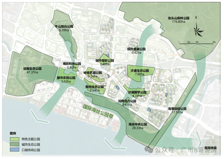 拥揽珠江一线景观、关键还是南向望江,这是连琶洲都做不到,还背靠5000亩龙头山森林公园,南望珠江水,山水相依,所开发地块约90%界面朝向公园,打造 300 米见绿,500 米见园;加上片区规划“5+9”的“公园城市”,一流生态环境实现出门即入园。