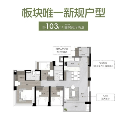 改善型户型优势更突出:103㎡四房配备独立入户花园与约 7 米通铺阳台,270° 全景采光大主卧可尽揽园林景观;105㎡四房主打南北对流,5 米大宽厅搭配 LDKB 一体化设计,主卧 L 型超 7 米转角飘窗提升观景体验;135㎡四房为南北通透双阳台布局,5.25 米大宽厅与 5.45 米大阳台彰显气派,主卧开间约 3.6 米,堪比紧凑三房客厅尺度。所有户型均采用高端装修标准,如东方既白岩板、雀眼木木饰面、8mm 超白玻璃、木纹砖等 99 项定制板材,全屋隐藏式中央空调交付,小户型亦配备智能马桶,品质感拉满。